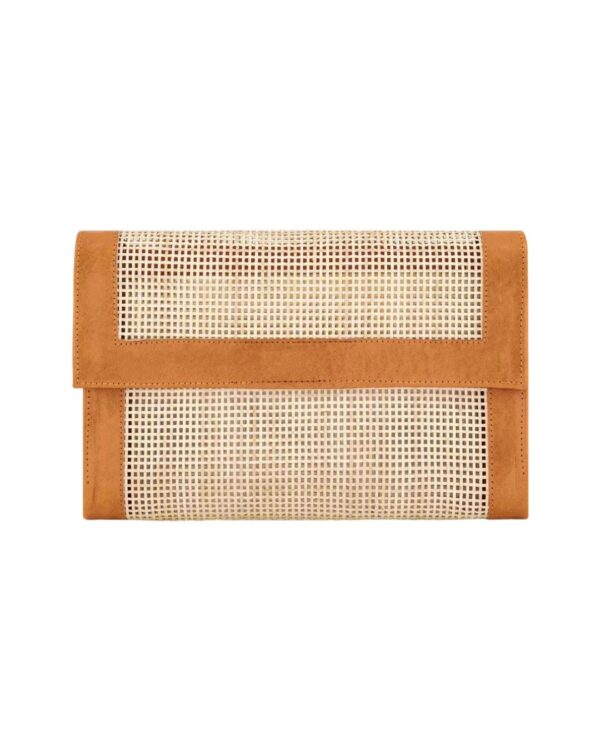 Blake Mesh Rattan & Leather Clutch – Caramel