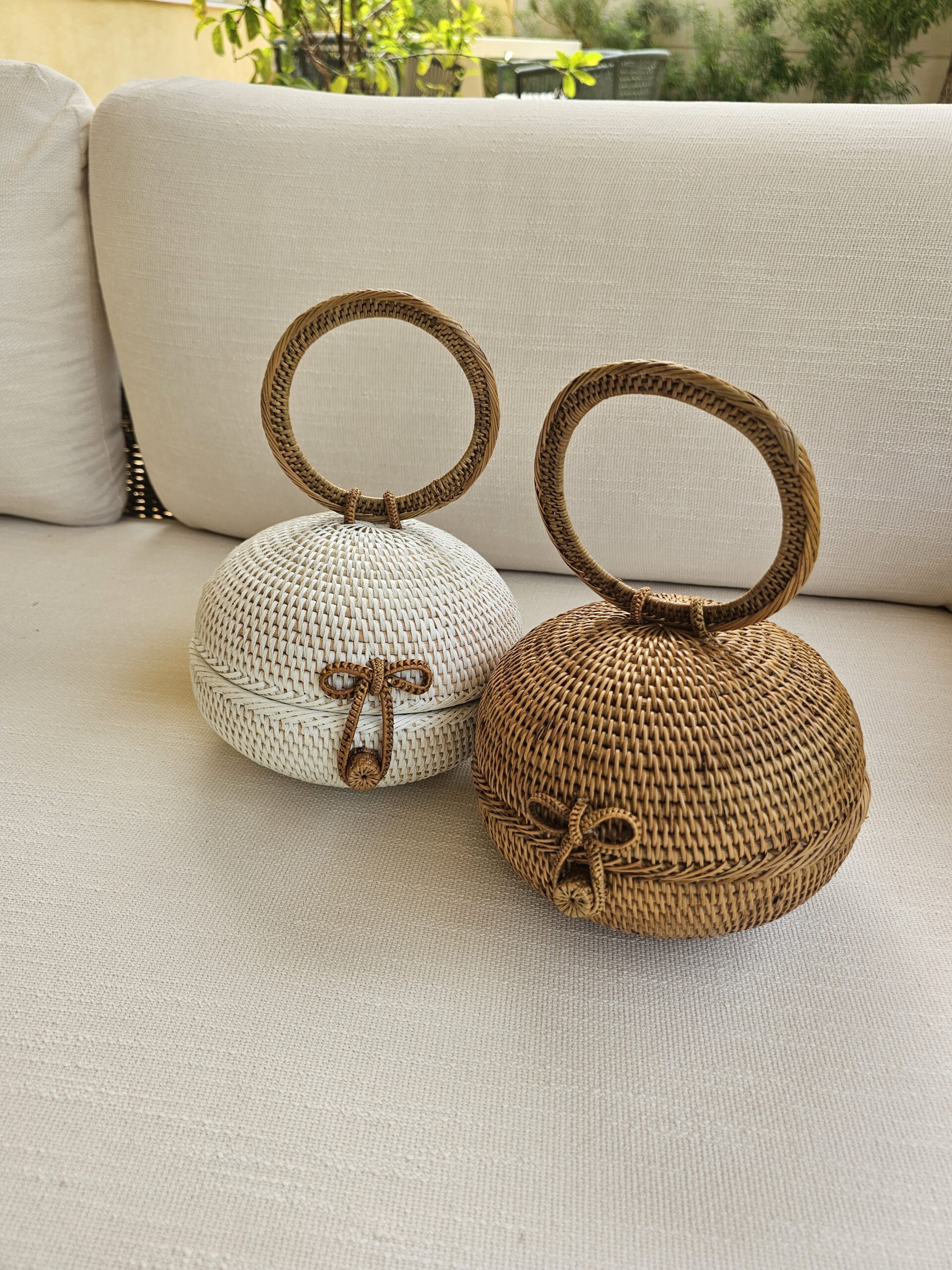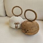 The Bounty is a handmade rattan bag, perfect accessory for your next beach getaway or weekend brunch by the seashore. Crafted by skilled artisans, it features a unique round shape with a sturdy circular handle and a charming woven bow clasp. The inside is lined with a cotton batik fabric, adding both character and practicality. Buy Bounty in both white or brown colour!