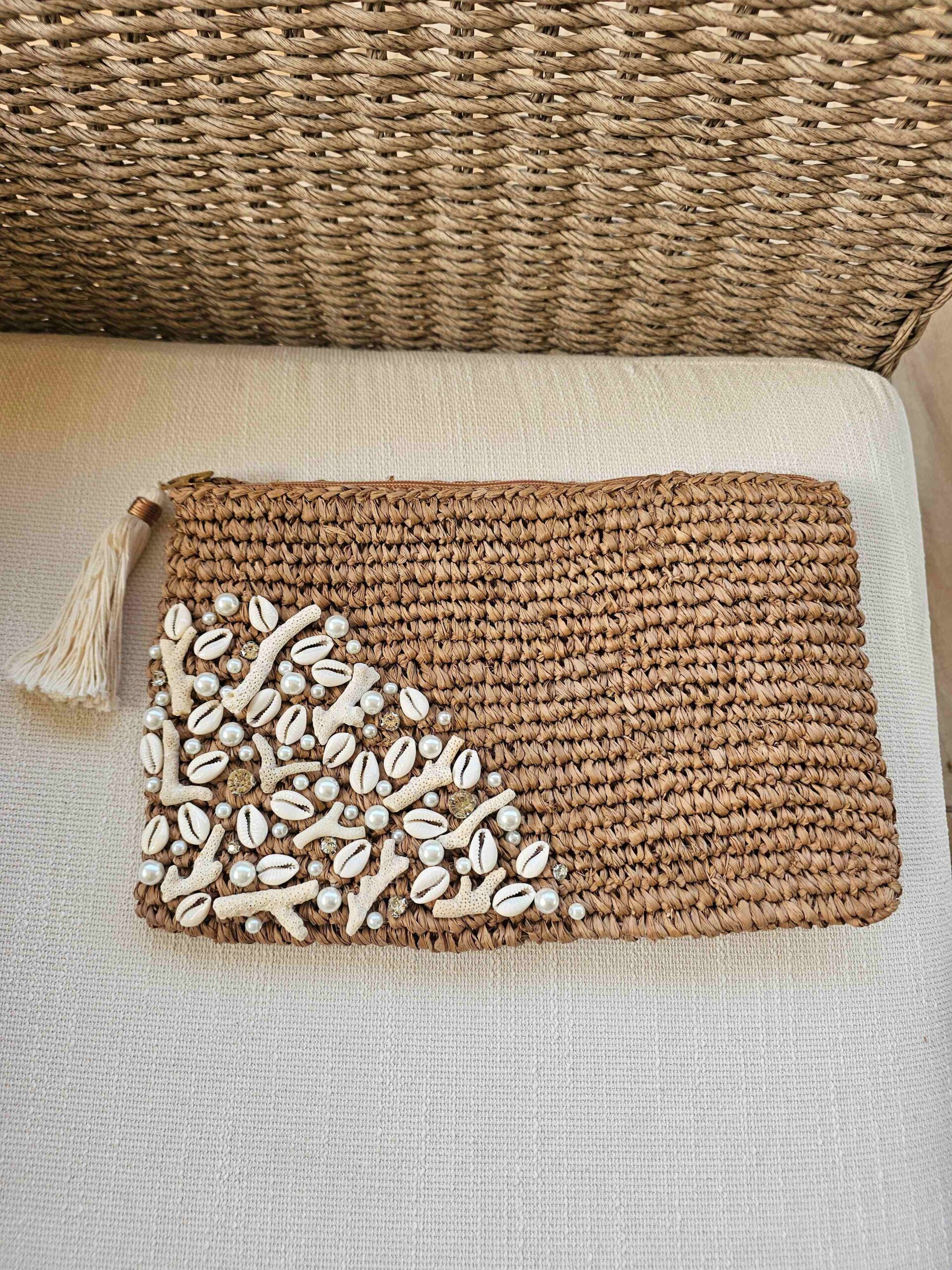 The Coralie – Lightweight, versatile, seaside chic clutch, your new go-to accessory for a touch of bohemian charm. Handwoven from natural raffia and adorned with natural shells and decorative pearls, it’s a statement clutch that carries the spirit of beach days. Compact and practical, it features a secure zip closure and tassel pull, ideal carrying your essentials from day to night.