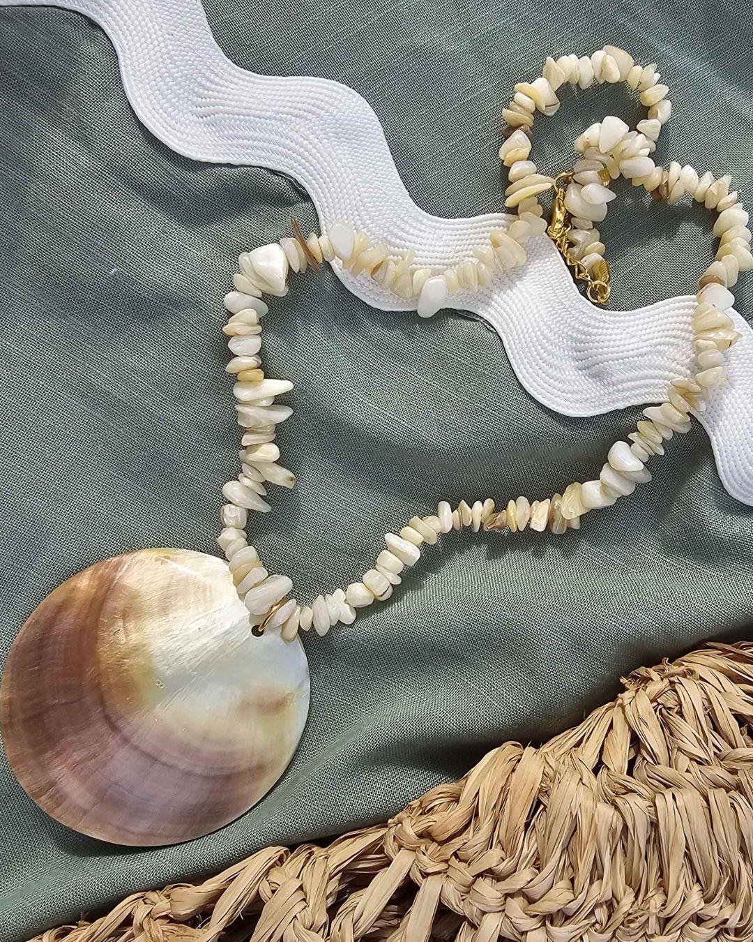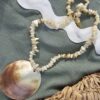 For real life mermaids only – Gigi mother-of-pearl shell necklace. Handmade with real shell and off-white glass beads, with golden-colour metal hook (adjustable length).