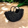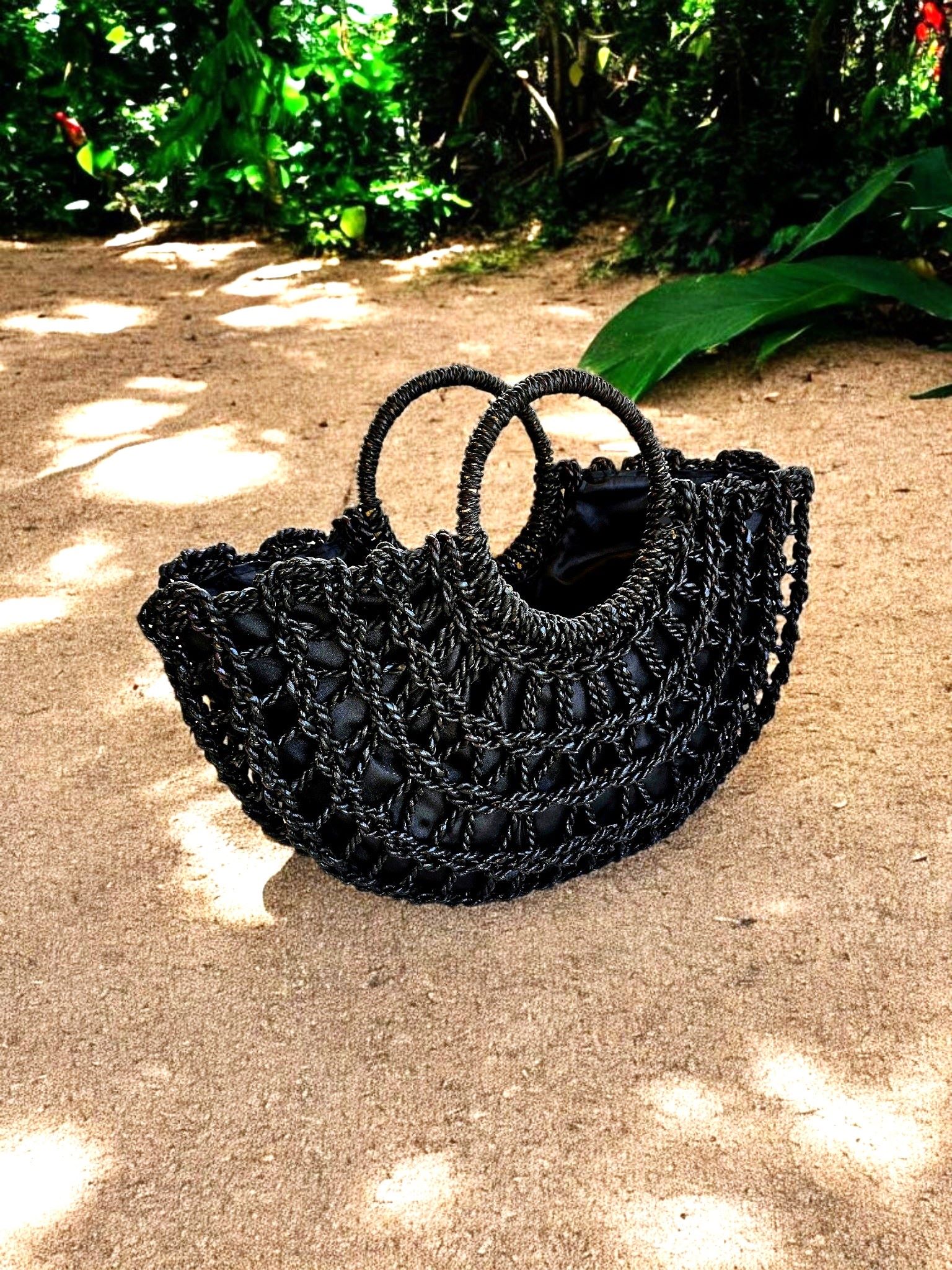 Stylish and unique Inga beach tote in deep black, is handmade of wide-weave natural agel in trendy seashore-inspired rope-style and is large enough to fit all your beach essentials. It’s very comfortable to carry along thanks to the lightweight structure and round handle. The bag has black satin lining with drawstring closure with wooden bead detail. The Inga is versatile from beach and beyond and compliments any summer outfit.