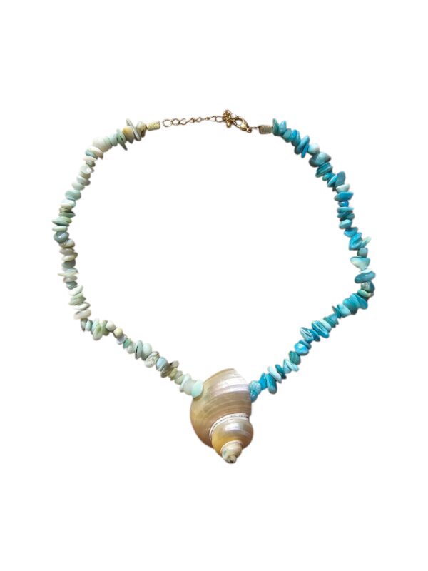 Feel the ocean breeze on your skin with Isla turbo shell necklace with beautiful blue and turquoise glass beads. From brunch till sundowners, simply stunning accessory for your beach holiday. The size is adjustable.
