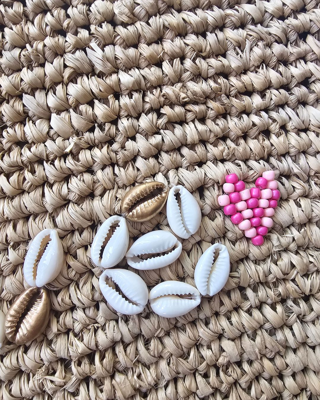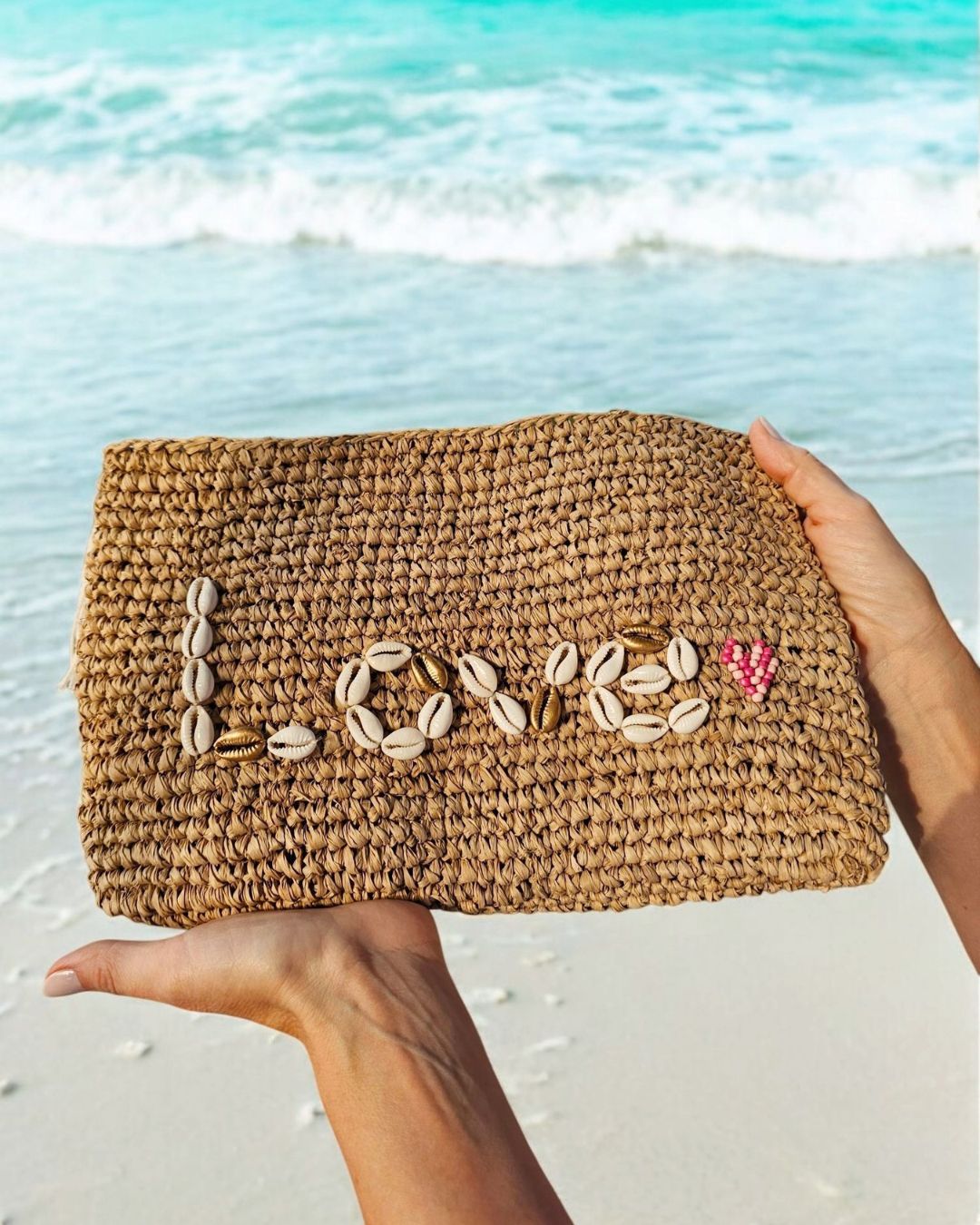 Love handwoven raffia clutch with white & gold cowrie shell and beaded heart decoration is the cutest accessory to bring along to your next visit to the beach!