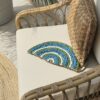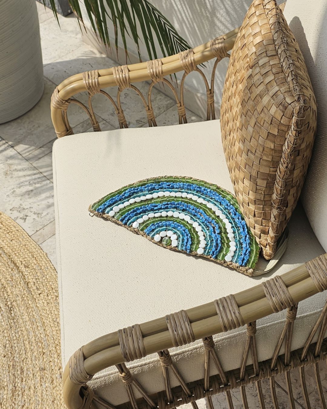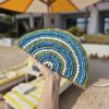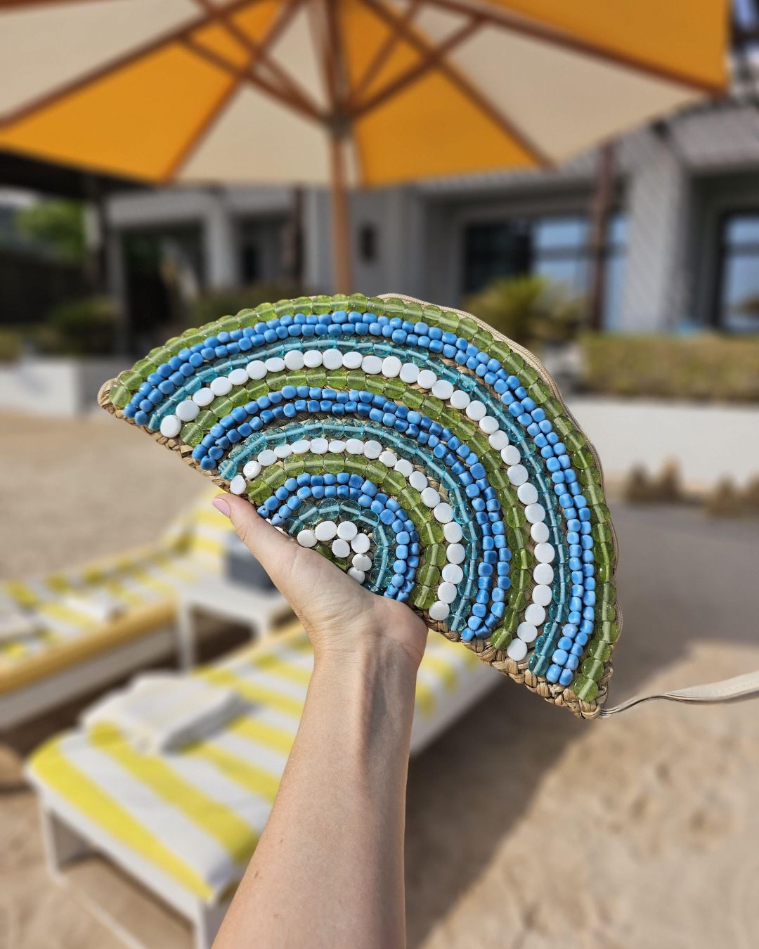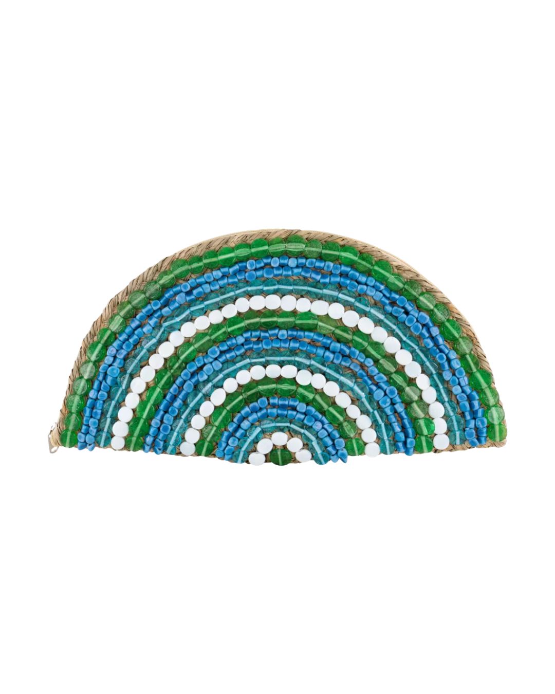 Just Stunning handwoven natural seagrass LUNA Lake Clutch with popular half-moon shape and hundreds of beautiful hand-stitched glass beads in ocean colours.
