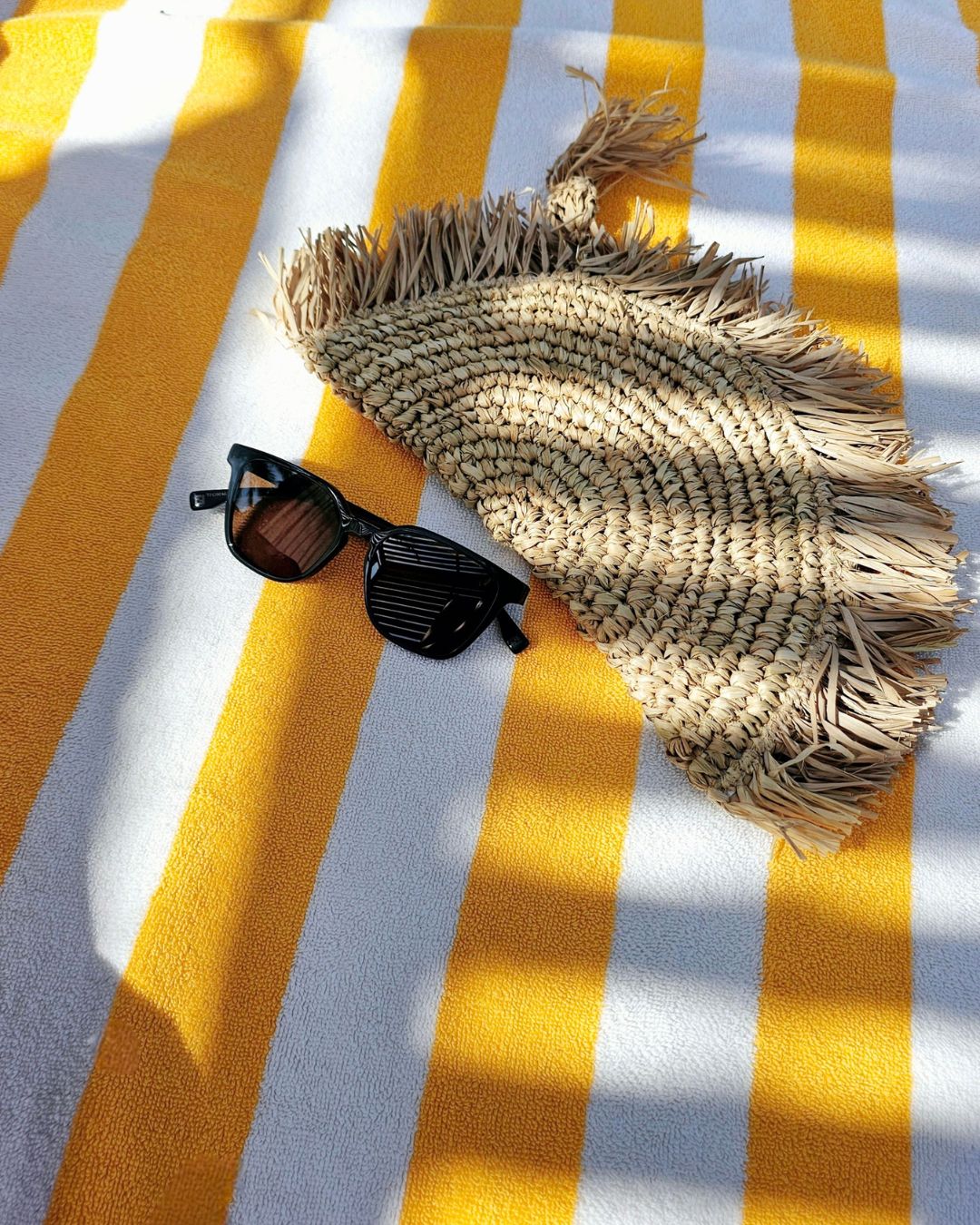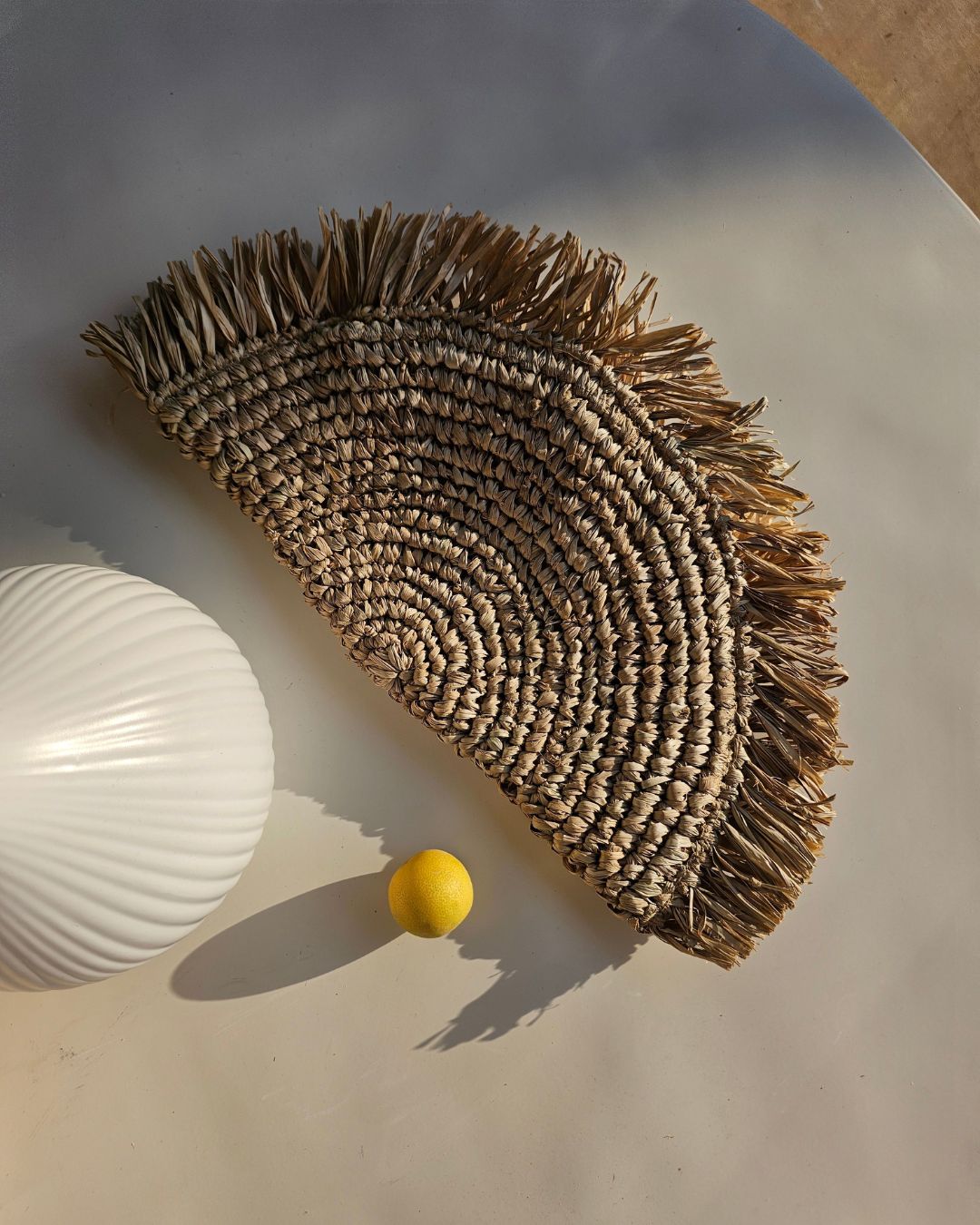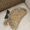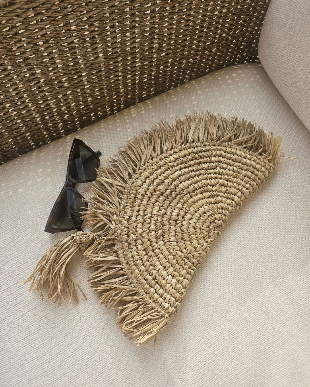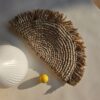 This semi-circular raffia pouch features a beautifully woven texture and fringed edges and tassel, perfect for adding a touch of natural elegance to your accessories collection.