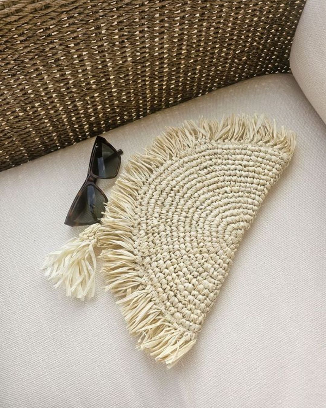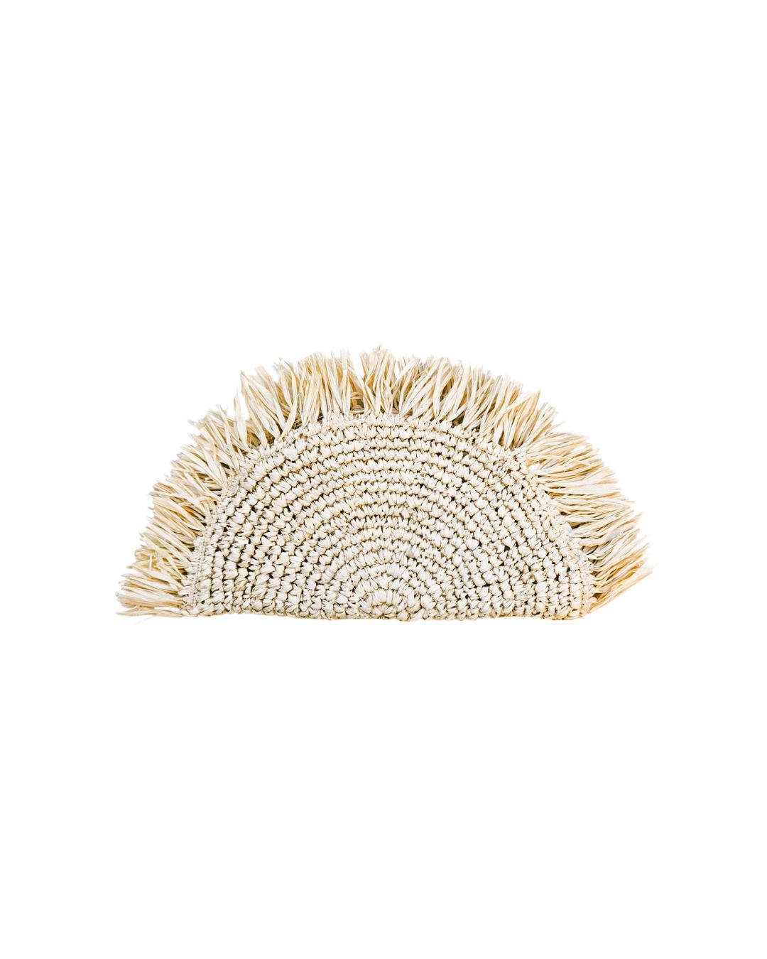 This semi-circular raffia pouch features a beautifully woven texture and fringed edges and tassel, perfect for adding a touch of natural elegance to your accessories collection.