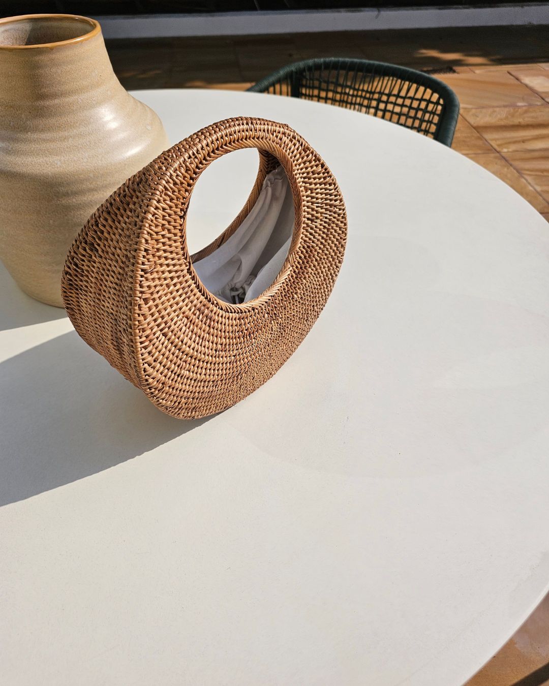 Introducing the Maxine Rattan Handbag, where timeless style meets modern practicality. Handwoven with meticulous craftsmanship, this chestnut rattan handbag features a soft, black cotton lining and drawstring closure to secure your essentials neatly tucked away. With its rounded shape and intricate weave, this handbag is perfect for both beach days and city strolls, effortlessly complementing your summer wardrobe.