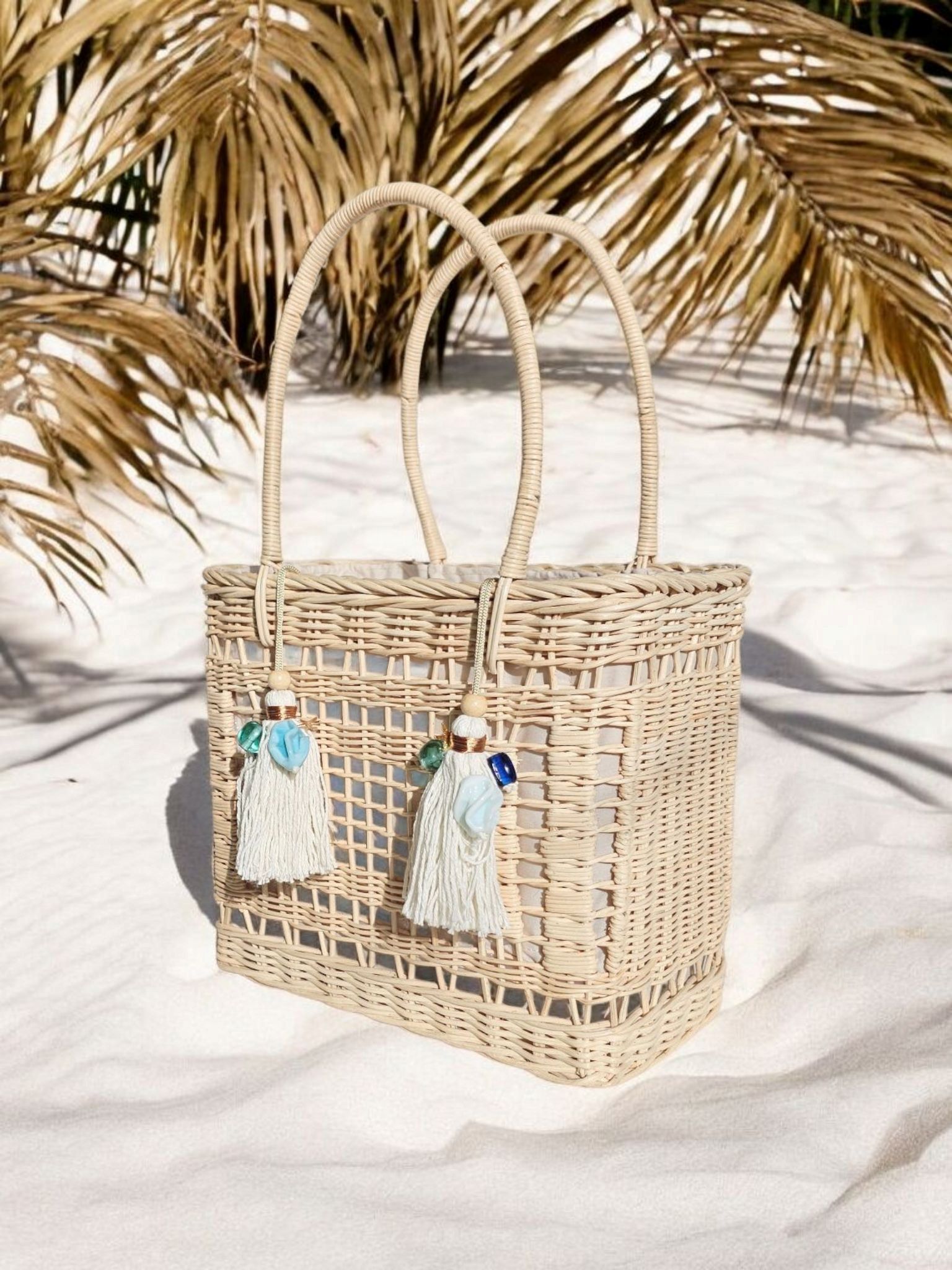 This functional, handwoven vanilla white wicker basket is your perfect companion on your busy summer day strolling around the city or beach.