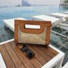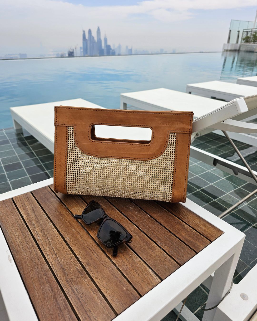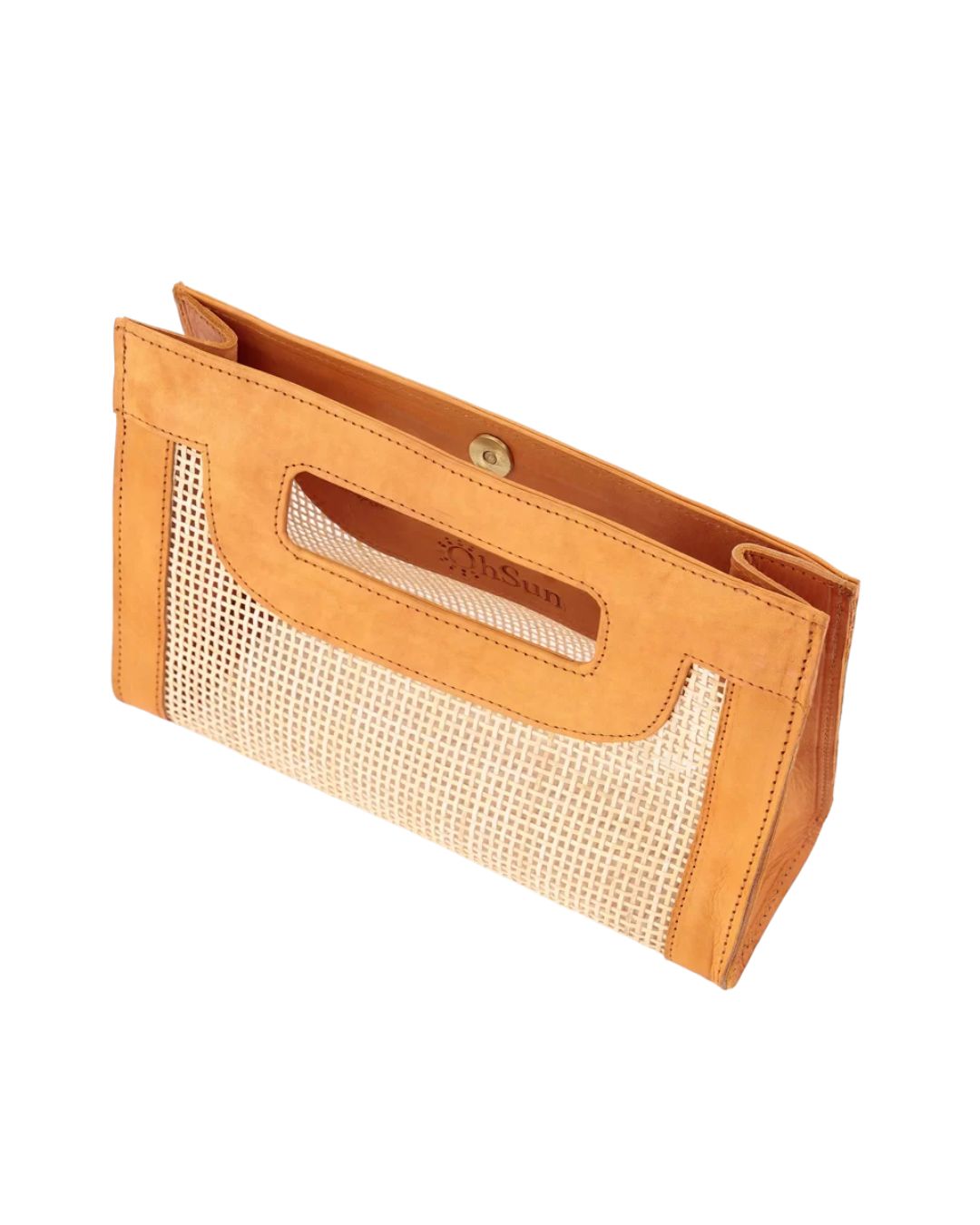 One-of-a-kind Caramel Brown Leather and Rattan Naomi Clutch to compliment your look for breakfast, lunch and dinner! Beautifully handmade to the perfection.