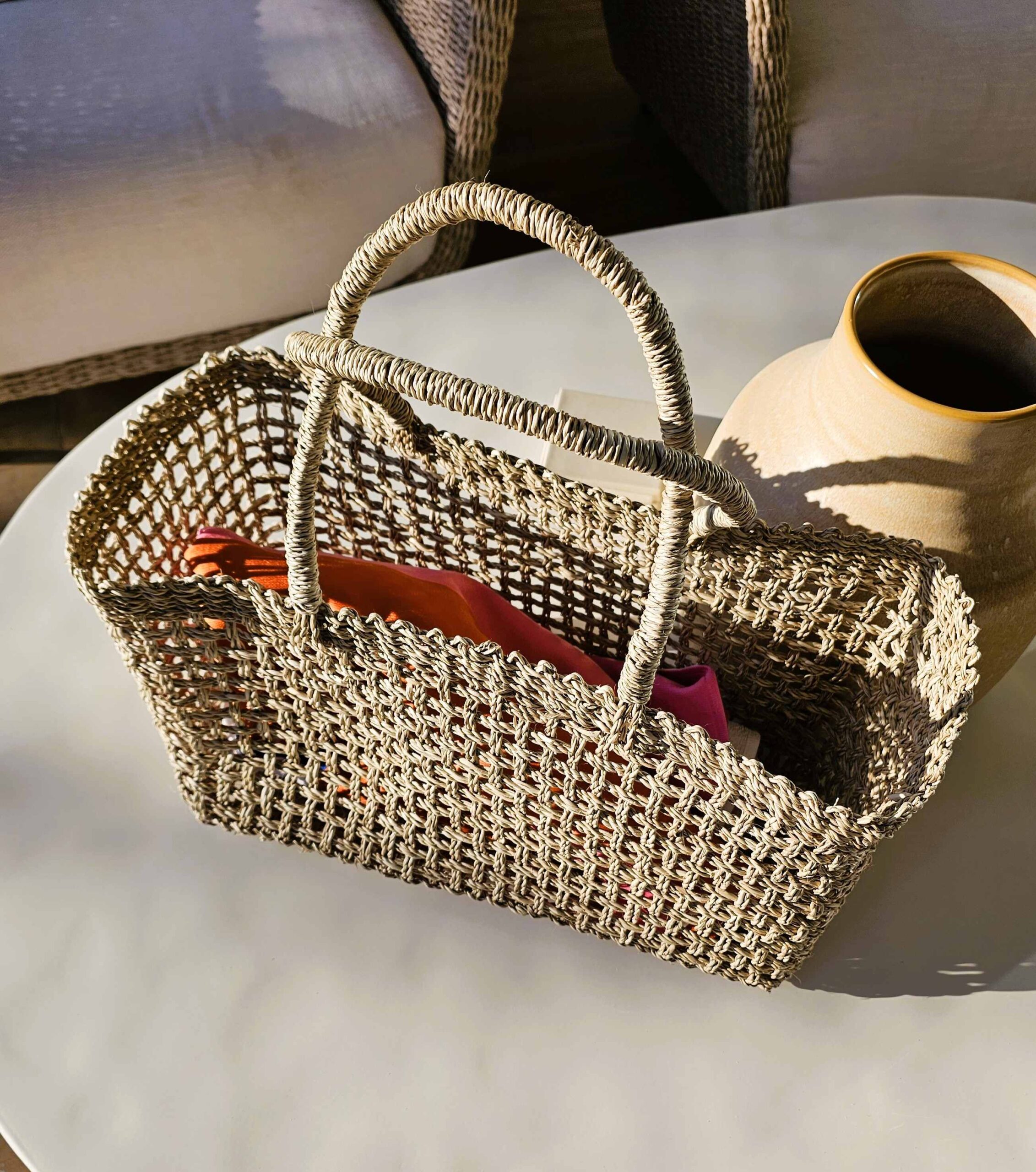 Our bestseller is back! One-of-a-kind Raegan tote is handmade of wide-weave natural agel, roomy enough to fit all your beach day belongings in one bag!
